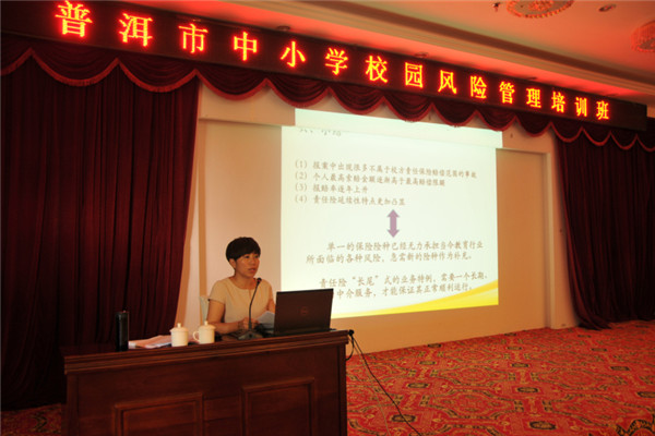 為認(rèn)真貫徹落實(shí)《云南省教育廳關(guān)于舉辦中小學(xué)校園風(fēng)險管理培訓(xùn)班的通知》(云教函[2015]317號)文件精神,進(jìn)一步加強(qiáng)普洱市學(xué)校安全教育和管理工作,切實(shí)提高基層學(xué)校風(fēng)險防控的能力,于2015年8月25日舉辦了義務(wù)教育階段學(xué)校校園風(fēng)險管理培訓(xùn)班。我公司特邀請專業(yè)律師和保險專家,組成培訓(xùn)小組,對參訓(xùn)人員進(jìn)行了培訓(xùn)。專業(yè)律師和保險專家圍繞依法治校、安全管理方法、法律風(fēng)險規(guī)避方法、教育風(fēng)險及風(fēng)險管理辦法、保險法等內(nèi)容展開了詳細(xì)的講解。我公司業(yè)務(wù)總監(jiān)羅琳對2014學(xué)年受理的校方責(zé)任保險案例作了詳盡的分析,并提出了相關(guān)風(fēng)險管理建議。她指出,我省校園安全責(zé)任事故類型主要以意外傷害事故為主,因此加強(qiáng)安全與防范教育以及校園課間管理尤為重要。客服部鄧曉麗詳細(xì)解釋了《云南省教育廳等四部門關(guān)于加強(qiáng)學(xué)校保險工作的指導(dǎo)意見》(云教體[2014]26號)中所列的險種,并提出了相關(guān)建議。